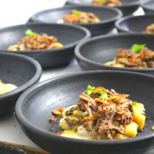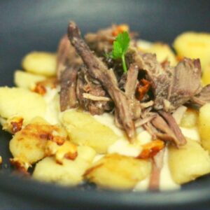Nhoque de macaxeira com molho de queijo de cabra, ragu de costela e queijo coalho desidratado