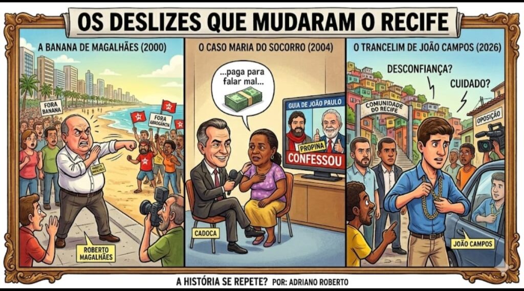 Na política, o favoritismo é um cristal valioso, mas extremamente frágil. Ao longo da minha carreira, acompanhei de perto episódios que mudaram o destino de Pernambuco nos bastidores e nas ruas. Vivi intensamente (na equipe do guia do rádio com o saudoso, Edvaldo Moraes) dois casos mais emblemáticos de como o “salto alto” e o erro de cálculo podem destruir uma eleição ganha: o de Roberto Magalhães em Boa Viagem e o de Cadoca no Pina. Hoje, vejo um novo ingrediente nesse caldeirão: o caso do “trancelim” de João Campos.